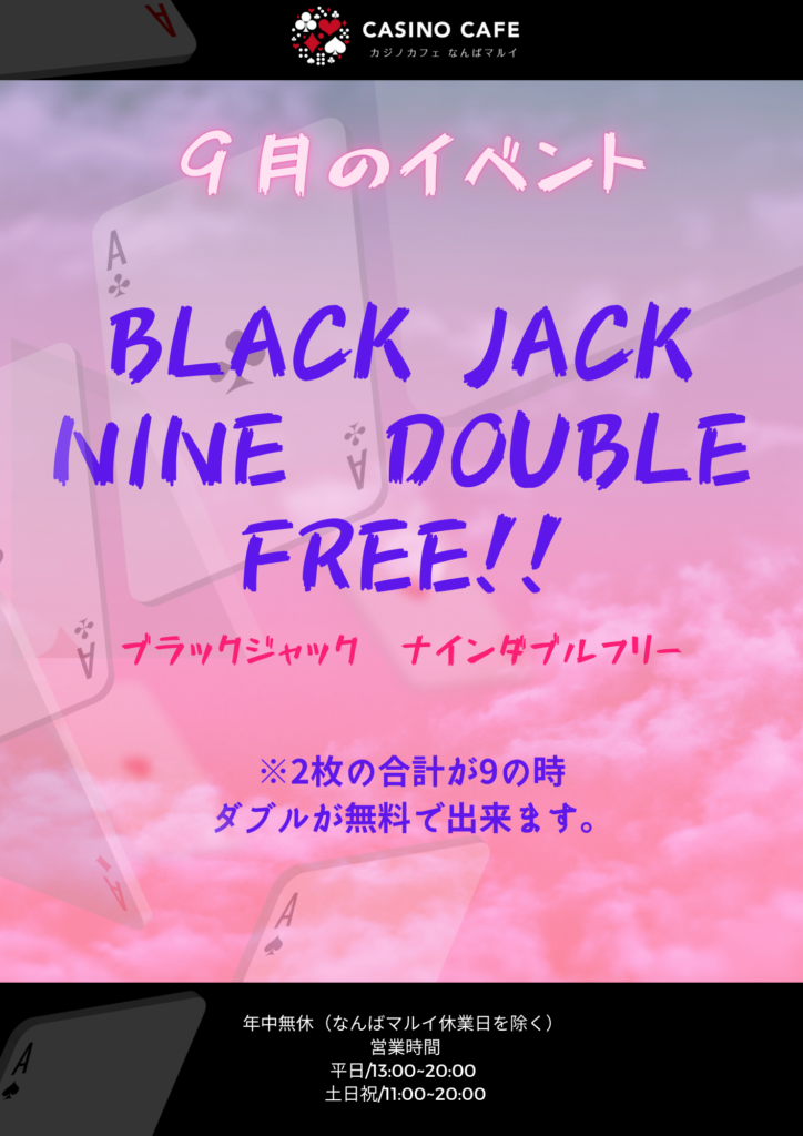 9月は⑨にちなんでブラックジャックのダブルがお得になります。 最初の2枚で合計数が9の時のダブルを無料で行うことができます。 ディーラー側のルールは引き続きプレイヤー側に有利なイベントとなっておりますので、この機会にチップを増やしましょう!!