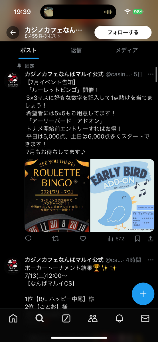 特別イベントの告知も、SNSでタイムリーに配信されています。公式Twitterアカウントをフォローすることで、カジノカフェなんばマルイの最新情報をいち早くキャッチすることが可能です。
